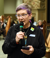 Karen Peterson playing the harp as a teenager because she was too lazy to practice violin or piano. After years of attending folk harp conferences, she noticed that many adult students were frustrated with their progress on the harp. This motivated her to become a harp coach, encouraging adult students of all abilities to find enjoyment in this magical instrument. Fear of brides inspired her to use her harp powers for service instead of ceremonies; she became a Certified Music Practitioner, and has provided therapeutic music to patients and staff since 2010 on her double-strung harp. Karen was on the Board of Directors of the Music for Healing and Transition Program for nine years, ending as President. She is the author of two books, Enjoy the Modes and Enjoy the Dorian Mode, which take advantage of how harpers use the same hand position for both major and minor chords. Her favorite music to play on the harp is Top 40 hits from the 1960s to today. Website